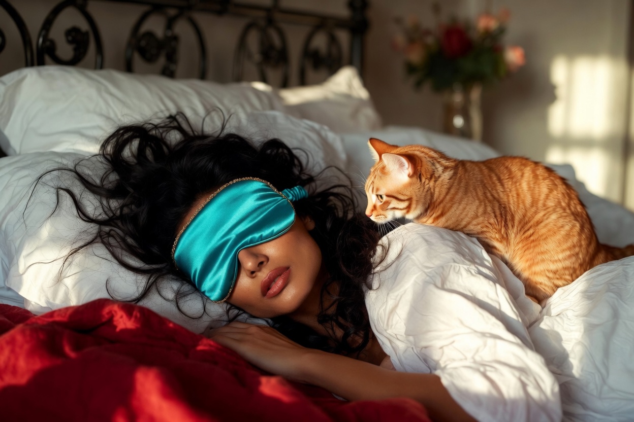 [Grok Project] Recreate the iconic interaction between Audrey Hepburn's character in Breakfast at Tiffany's (1961) and the orange cat in bed, but with a main character who looks more like me.